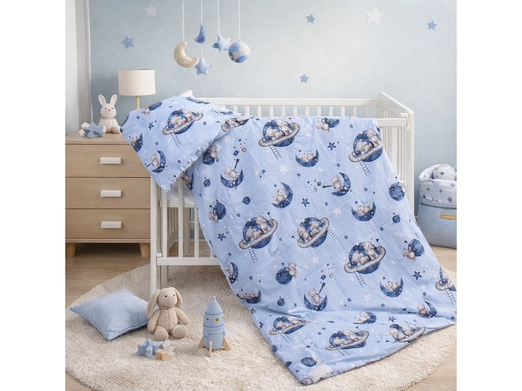 Povlečení do postýlky 2dílné - Scarlett Arbas - 135 x 100 cm - modrá – kvalitní dětské povlečení z 100% bavlny pro pohodlný a bezpečný spánek. Souprava obsahuje peřinku v rozměru 100x135cm a polštářek 60×40 cm. Bavlna je jemná, prodyšná a vhodná i pro citlivou pokožku. Praktické zapínání na zip usnadňuje převlékání. Ideální volba pro každou postýlku.